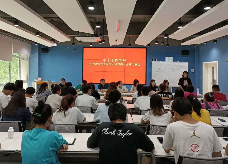 2021年5月18日12:40,电子工程学院团学干部培训工作在6A310教室进行,出席本次会议的有党总支副书记邹联丰,学工办主任焦文达,组织员房新荷,辅导员王净丰、张家宁及全体部门负责人。
