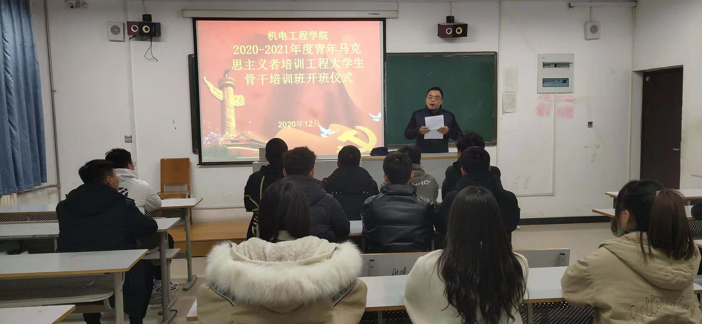 12月24日下午17点,机电工程学院举行“青年马克思主义者培养工程”2020-2021年度大学生骨干培训班开班仪式。机电工程学院党总支副书记宋宪华、机电工程学院团总支书记楚钊,“青马工程”全体学员参加开班仪式。
