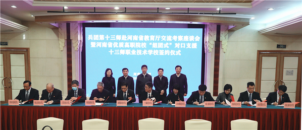 11月10日上午,河南省优质高职院校“组团式”对口支援十三师职业技术学校签约仪式在郑州举行。兵团第十三师党委副书记、师长鄂宏达,兵团第十三师党委副书记、副师长、河南省对口援疆工作前方指挥部副总指挥、党委副书记、纪委书记杨建国,兵团第十三师党委常委、副师长、河南省对口援疆工作前方指挥部党委副书记朱自锋,河南省教育厅党组书记、厅长郑邦山,省教育厅党组成员、副厅长毛杰出席座谈会,河南省教育厅党组成员、副厅长、一级巡视员刁玉华主持座谈会。我校党委书记许琰参加会议,并代表学校与十三师职业学校签订了对口支援协议书。