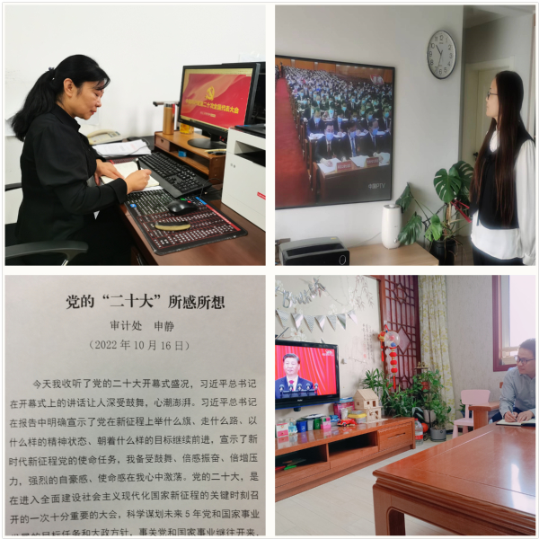 10月16日上午,中国共产党第二十次全国代表大会在北京隆重开幕。审计处党支部高度重视,严格按照疫情防控要求,精心组织全体人员通过电视、手机等媒体收听收看大会直播,全程认真聆听习近平总书记代表第十九届中央委员会向大会作报告,不时记录报告中的精彩金句。
