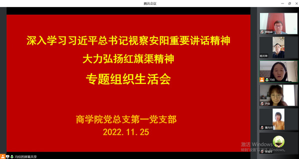 11月25日,为深入学习贯彻党的二十大精神和习近平总书记视察河南安阳重要讲话精神,按照校党委统一部署,商学院第一党支部、第二党支部通过线上会议的形式,分别召开了“深入学习习近平总书记视察安阳重要讲话精神,大力弘扬红旗渠精神”为主题的专题组织生活会。