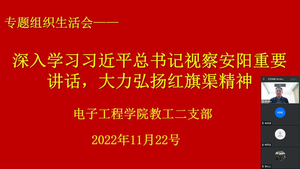 为深入学习贯彻党的二十大精神和习近平总书记视察河南安阳重要讲话精神,按照省委教育工委和校党委通知要求,11月22日下午,电子工程学院党总支下属教工一支部和教工二支部分别在线上,以“深入学习习近平总书记视察安阳重要讲话精神,大力弘扬红旗渠精神”为主题,结合学院工作实际,召开组织生活会。