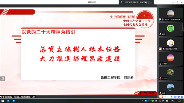 11月29日下午,铁道工程学院党总支开展学习宣传贯彻党的二十大精神专题党课,党课由院长王亦军主持,党总支书记郭运宏做作专题报告,铁道工程学院全体党员参加,党课以线上会议方式进行。