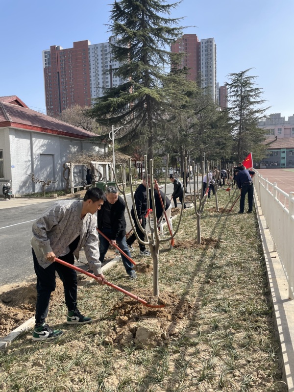 参加党员和职工志愿者每两人一组,挖坑、放树、填土、浇水,将一颗颗海棠树栽种在校园。经过全体人员的辛勤劳作,近30棵海棠树栽种完毕,期待几年后海棠花能绽放满园,让校园多一片新绿,让天空多一片蔚蓝!