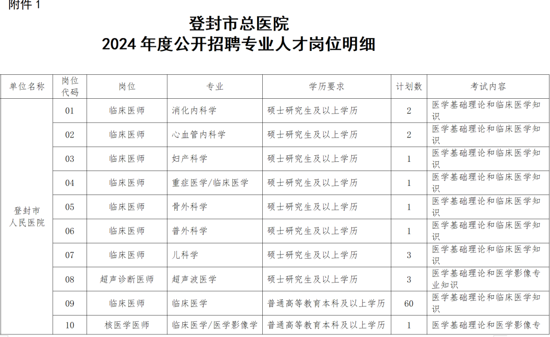 登封总医院2024年度公开招聘医疗专业技术、行政管理等工作人员250名,其中登封市人民医院133名、登封市人民中医院53名、登封市妇幼保健院45名、登封市总医院乡镇和社区分院19名,具体招聘岗位及计划数详见附件。