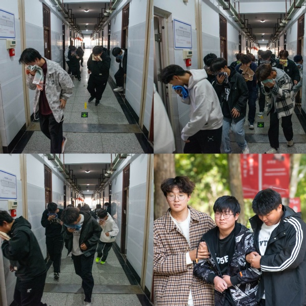 随着警报响起,消防演练正式开始。在书院负责人和育人导师的引导下,学生们迅速用湿毛巾捂住口鼻、弯腰低姿按照疏散路线撤离,前往指定安全区域,安全员清点人数,确保学生全部安全撤离。整个过程紧张有序、规范高效,大家保持冷静、行动迅速,展现了良好的应急反应能力。