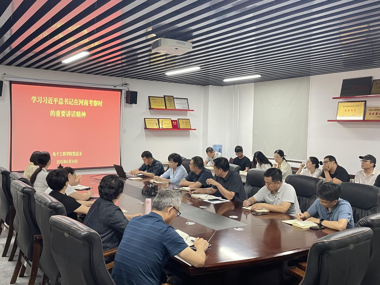 6月10日,电子工程学院党总支在学院会议室召开学习贯彻习近平总书记在河南考察时的重要讲话精神专题会议,全体教职工参加会议。