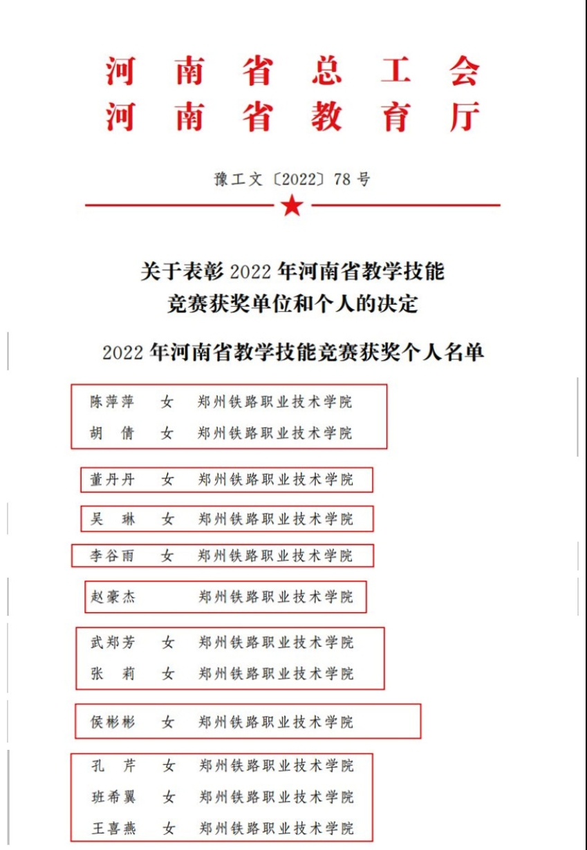 日前,河南省总工会、河南省教育厅在全省教育系统开展了高等院校教学技能竞赛,根据河南省总工会、河南省教育厅《关于表彰2022年河南省教学技能竞赛获奖单位和个人的决定》,我校工会推荐的12名选手参加竞赛,其中陈萍萍、胡倩、董丹丹、吴琳4名教师获得河南省总工会和省教育厅联合省赛的一等奖,并获得“河南省教学标兵”荣誉称号;李谷雨、赵豪杰、武郑芳、张莉、侯彬彬5名教师获得二等奖;孔芹、班希翼、王喜燕3名教师获得三等奖。