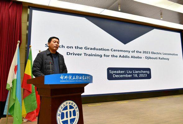 马玉霞首先代表学校向全体学员表示热烈祝贺。在致辞中指出,6个月的培训期间,学员们系统学习了机车构造、机车检修、安全运行和乘务作业方面的理论知识,还前往中国铁路郑州局集团有限公司开展了跟车实习。在校企双方的悉心教导下,学员们的岗位知识、实操技能、职业综合素养都得到了全面提升,为学员们今后职业发展奠定了坚实基础。学校祝愿学员们成为铁路事业上的佼佼者、赓续中非友谊的推动者,为当地社会经济发展作出应有贡献。马玉霞表示,今年是共建“一带一路”十周年,也是埃塞俄比亚和吉布提两国轨道交通事业高速发展的十周年。10年来,我们见证了亚吉铁路给东非地区带来的巨大变化,也见证了中非人民结下的深厚友谊。