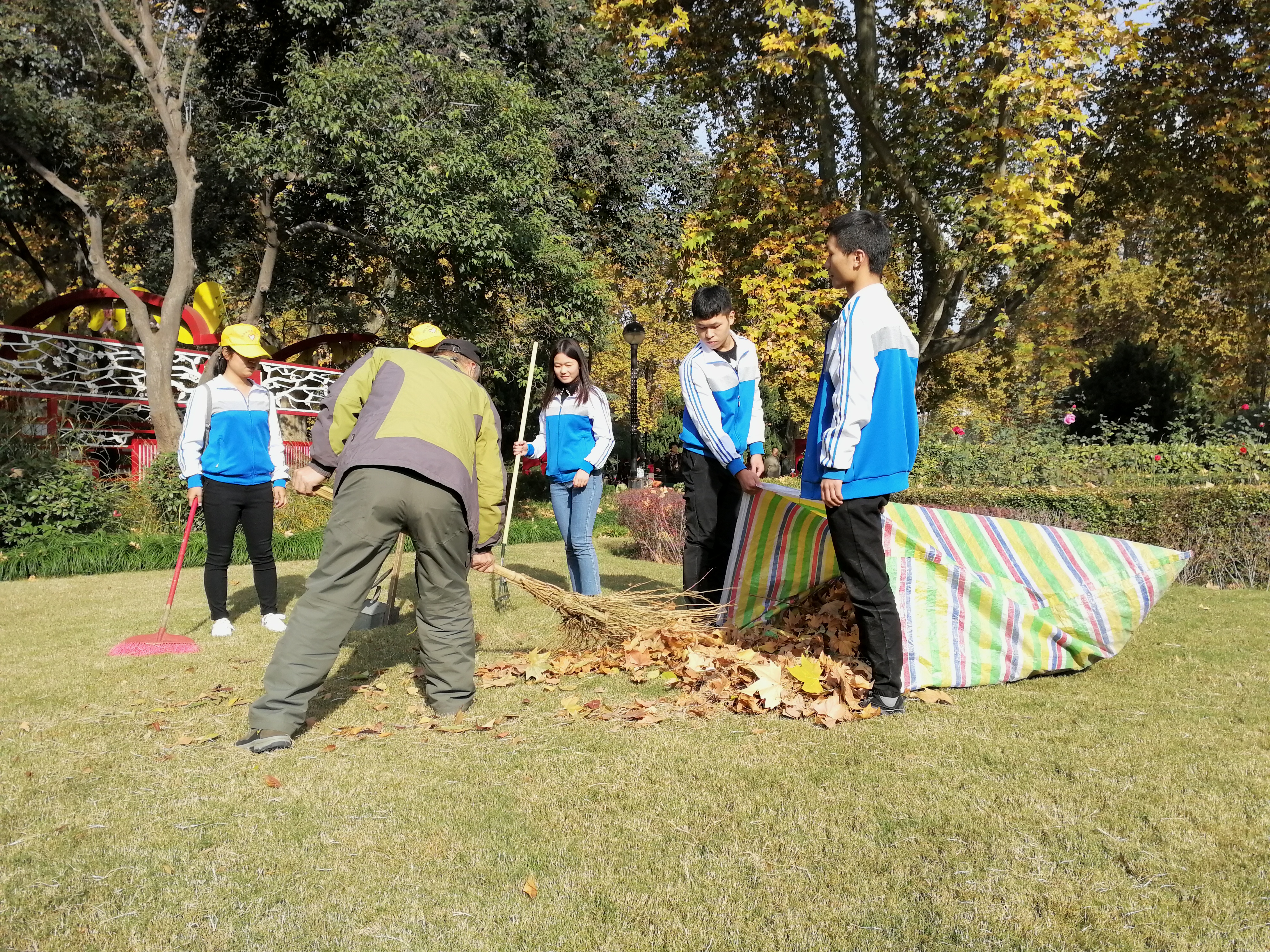 | 为培养同学们的劳动精神和环保意识,运输管理系青年志愿者协会于2017年11月11日早上8点20分前往郑州市人民公园进行“树叶不落地,郑州更美丽”志愿服务活动,途经40分钟,大家成功抵达郑州市人民公园。 到达目的地后,志愿者们排好队依次进入,由各小组组长带领各组队员跟进园内负责人进行活动。各组员到达指定地点后,开始拿上扫帚对草坪上的落叶进行清扫活动。志愿者们热情积极,认真配合园内负责人清理各地落叶,每一位志愿者都不怕脏不怕累,劳动起来十分专注,细心地清扫每一个角落的落叶。经志愿者们近一个小时的劳动后,公园里的环境已被清理的十分干净,志愿者们看着自己的劳动成果,感到十分欣慰。 此次去人民公园清扫落叶,志愿者们利用课余时间,丰富了生活品质,培养了环保意识和劳动精神,同时也是个人精神素质的一种提升。