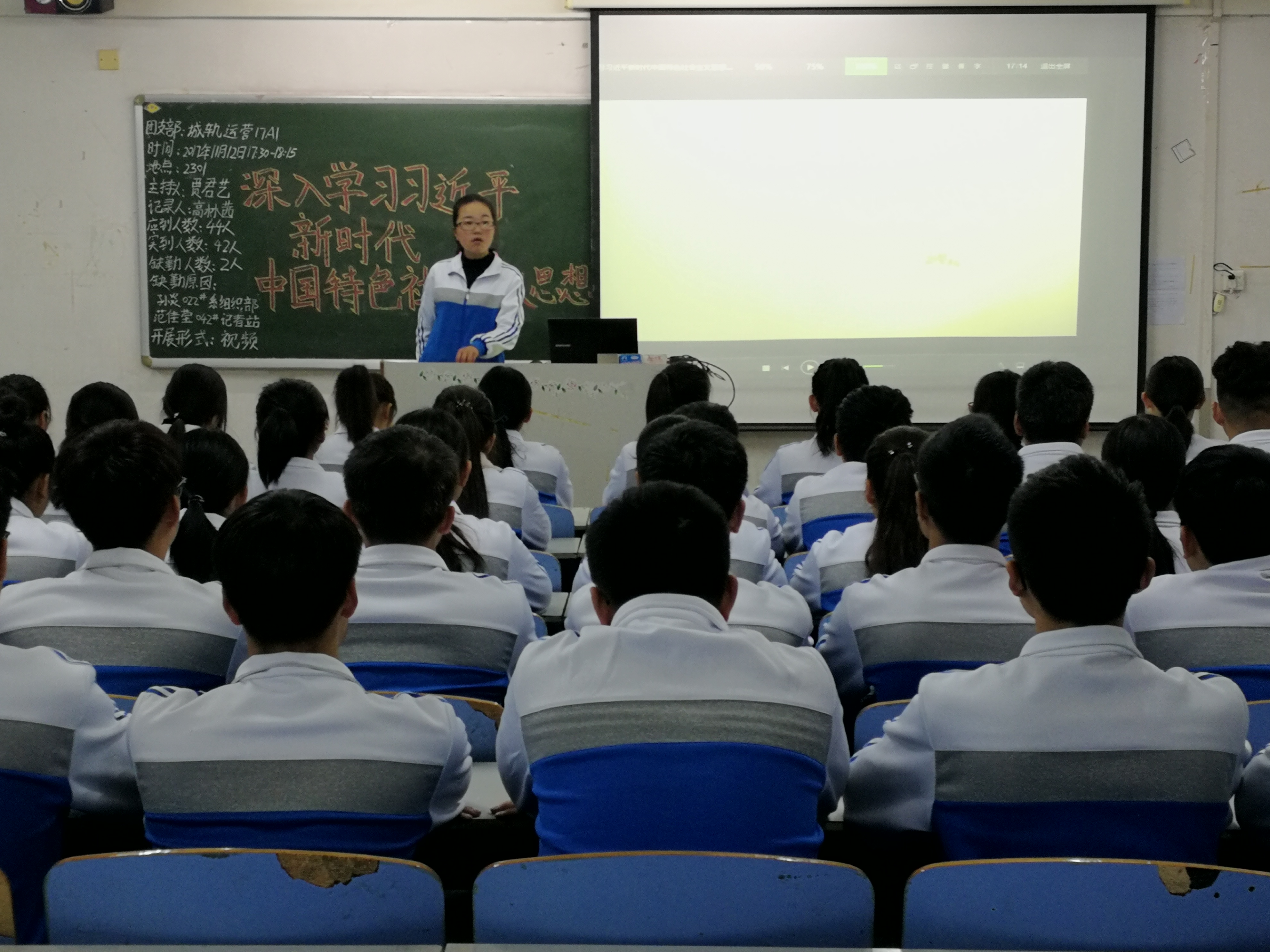 | 2017年11月12日17:00,运输管理系幸福校区开展了以“深入学习习近平新时代中国特色社会主义思想”为主题的团课学习活动,各班积极组织配合参了与此次活动。 活动开始前,各班班委组织学生依次入座,同学们积极配合。活动开始,各班班长组织观看相关团课视频,同学们认真观看,并积极学习此次团课内容。活动最后,各班班长进行了本次团课总结,同学们也积极表达了自己对于“新时代中国特色社会主义思想”的理解与感想。 本次团课学习,有助于提高同学们对于我国发展的关注度,树立正确思想争做当代文明大学生,为实现“中国梦”而不懈奋斗。