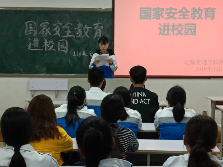 2018年4月22日晚,运输管理学院各班开展“国家安全教育进校园”主题班会。 首先,以视频的形式形象的向同学们展示出国家安全对国家的重要意义。让同学们了解国家安全知识, 认识到自己的责任。同学们坐姿端正,全神贯注的观看视频。其中,该视频主要对国家安全涉及范围广危害性大、国内出卖国家安全机密的官员层出不穷;、国民的国家安全观念有待提高等现象做出说明。进一步引发同学们有关国家安全的思考和对国家安全方面的认知。随后通过治保委员的演讲,让同学们更加了解国家安全的重要意义,从自身做起,共同维护国家安全。 这次活动将国家安全教育融入课堂,加强培养同学们辨别是非的能力,体会到国家安全是一个国家屹立于当今世界的最基本要求。让广大学生牢固树立总体国家安全观,增强国家安全意识。