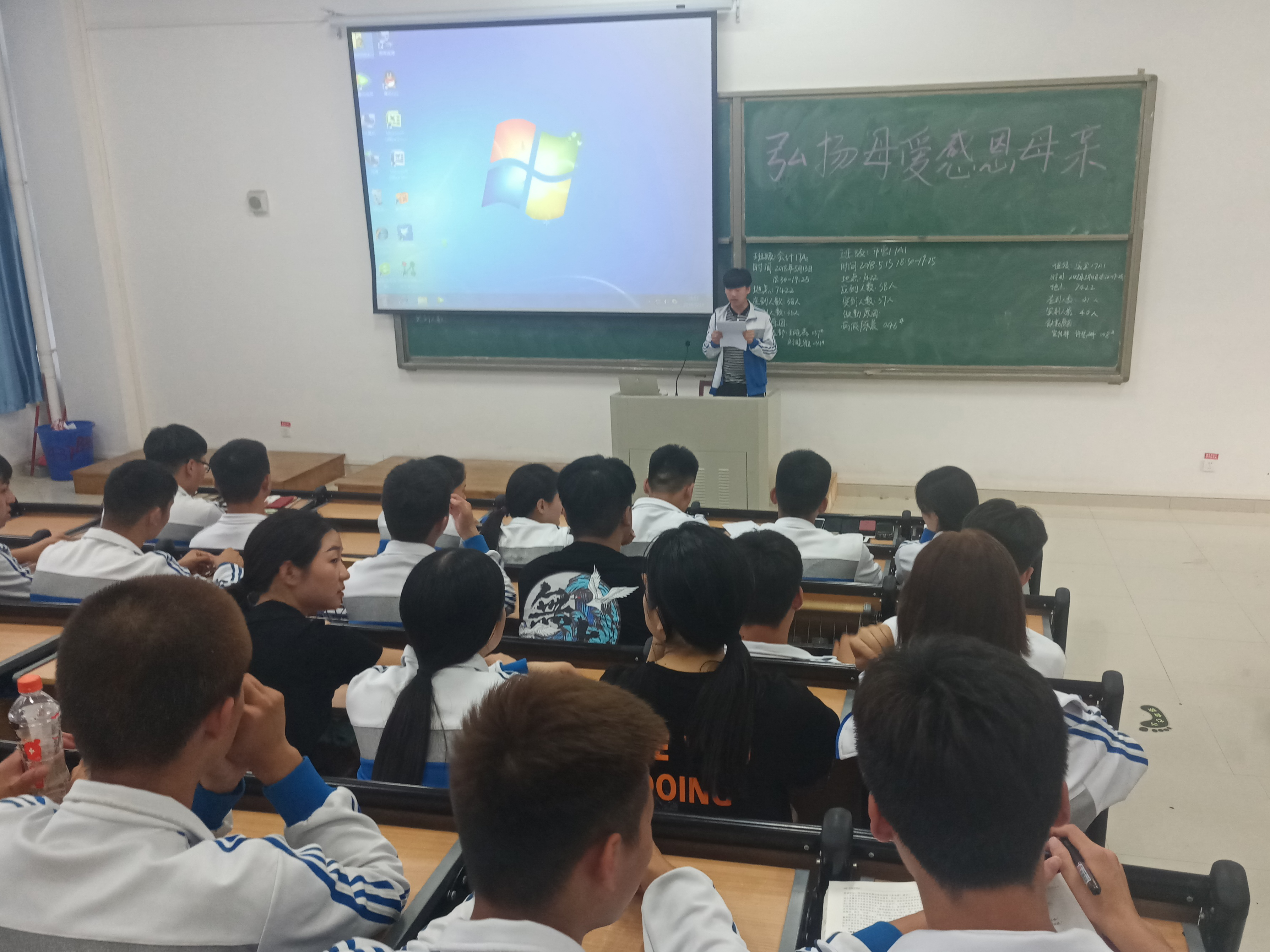 为歌颂母爱,弘扬中华民族传统美德,2018年5月13日晚,运输管理学院举办“弘扬母爱 感恩母亲”主题班会。本次班会由各班班长主持进行,全体同学身着系服参加。 班会以沙画视频《妈妈》为开头,讲述了妈妈陪孩子长大直到老去的故事,即使母亲已两鬓斑白,母爱也依旧始终不渝。视频感人肺腑,唤起了同学们埋藏在内心深处的感恩情怀,令他们真切感受到了母爱情深。接着,各班同学代表上台朗诵与母爱有关的文章,并分享出自己与母亲之间的故事,饱含情感的朗诵,真实暖心的故事,勾起了同学们与母亲之间的回忆。至此,班会在同学们的阵阵掌声中圆满结束。 本次班会旨在让同学们感受母爱的无私与伟大,让感恩之情盈满心间,培养大学生感恩的良好品行,弘扬中华民族感恩的传统美德。