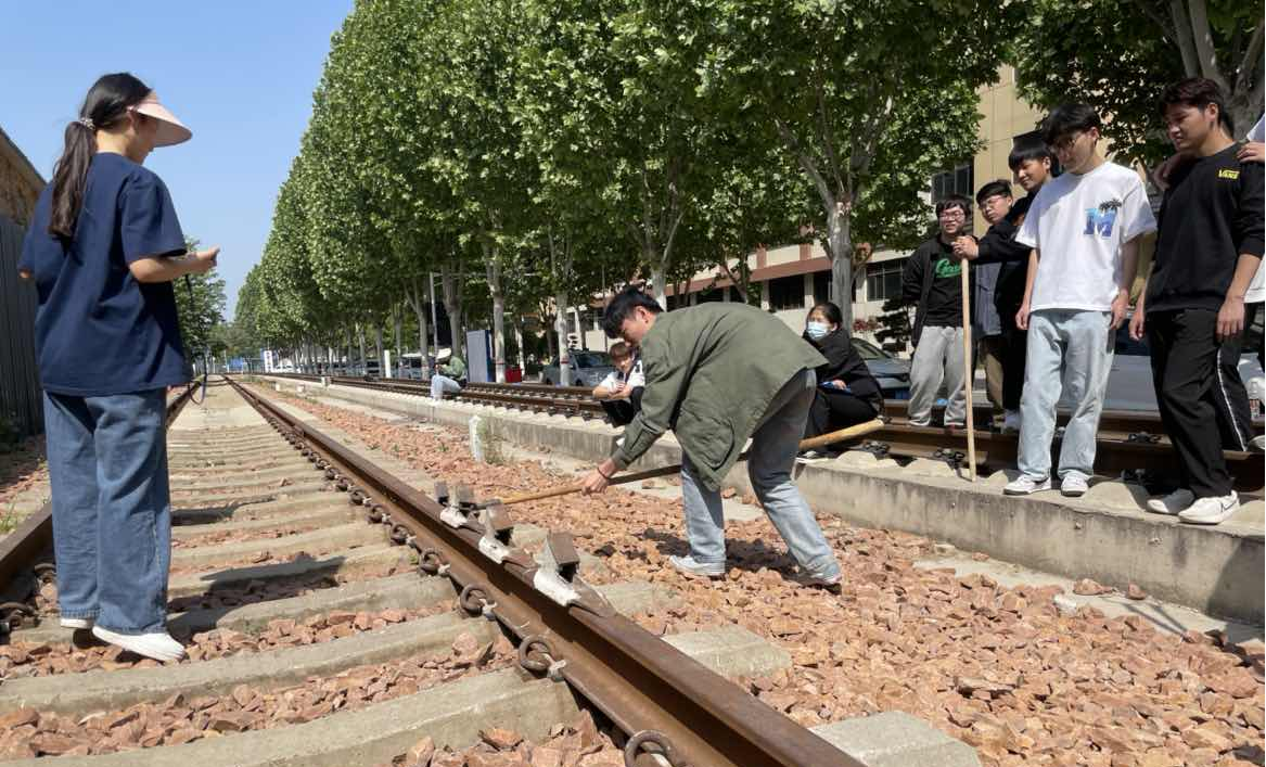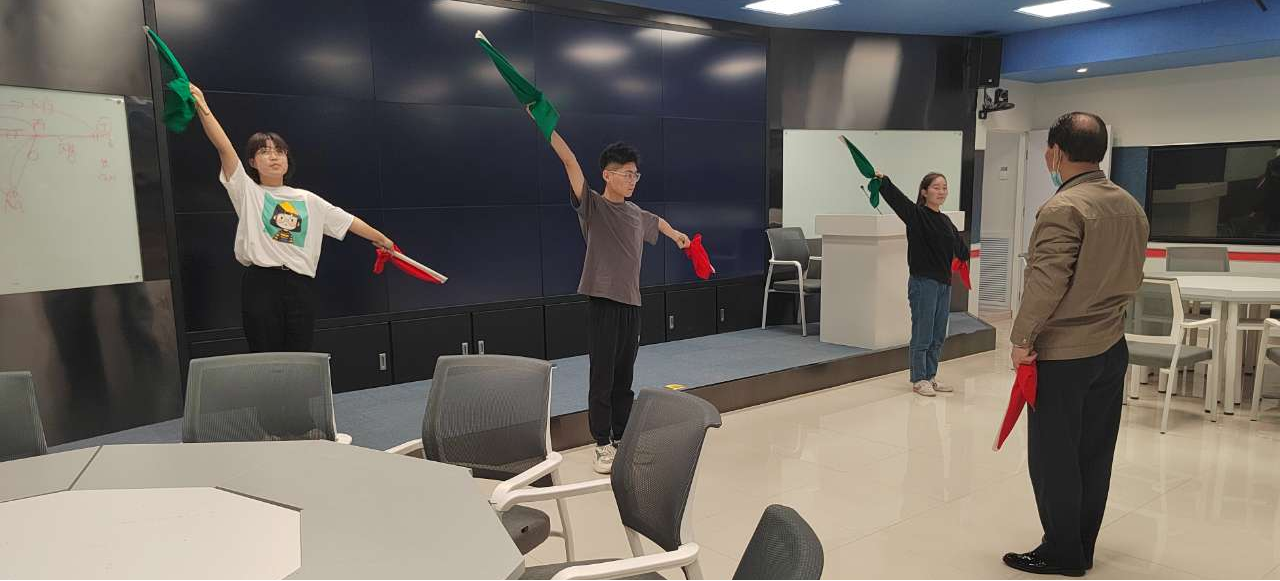 在进入五月份后,21级铁路运输专业的同学们除了完成理论课程的学习外,也在如火如荼的开展实训课程的训练。以车站调车工作课程为例,同学们在了解完调车相关的理论内容,例如调车手信号、排风摘接制动软管、人力制动机制动、铁鞋制动等内容,对各个班级学生都进行了相关项目的考核。 在手信号旗章节,虽然目前车站大规模采用无线调车灯显通讯设备,但是在一些特殊情况下手信号作为基本的通讯手段,也是同学们必须掌握的内容。