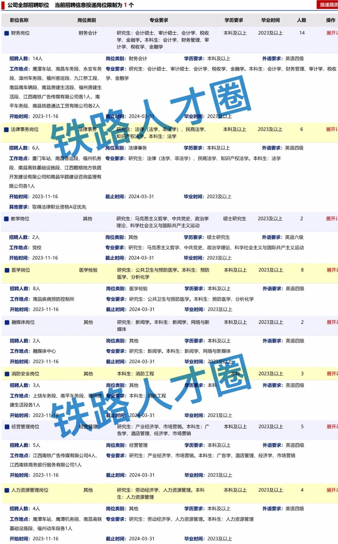 三、招聘流程 1.网上报名。报名采取网上报名方式,报名时间为2023年11月16 日至2024年3月31日。有意应聘的毕业生在规定时间 内登录中国铁路人才招聘网(http://rczp.china-railway.com.cn)进行报名,申请岗位时选择“中国铁路南昌局集团有限公司2024年度招聘本科及以上学历毕业生 公告(一)”所对应的岗位,每人限报1个岗位。毕业生本人如实填写所有报名信息,真实、准确、完整上传毕业生就业推荐 表、成绩单、学籍在线验证报告等电子附件,生成打印《毕业生应聘登记表》。 2.资格审查。根据招聘岗位要求,对应聘材料进行审核,择优筛选符合岗位要求的毕业生参加后续考试考核。未进入 考试考核环节的毕业生不另行通知。 3.考试考核。以面试考核方式为主,接到通知的毕业生按指定时间、地点参加,否则视为放弃应聘。根据考核结果择 优确定拟录用人选。 4.公示录用。拟录用人选通过中国铁路人才招聘网进行不少于7天的公示。公示期满无异议的,办理录用手续。 四、其他事项 1.本次招聘仅接受应聘人员本人在报名期间通过中国铁路人才招聘网报名,无其他报名方式,不接受邮寄、他人代交 简历或电子邮箱发送简历。 2.应聘毕业生在招聘期间须保持通信畅通,凡未在规定时间内回复我公司通知、未按规定时间、地点和要求参加各招 聘环节的,视为本人自动放弃。 3.所有信息须由毕业生本人如实填报,如发现网上填报及上传信息与实际信息不一致或弄虚作假的,取消应聘资格。 4.中国铁路南昌局集团有限公司不委托第三方招聘,不向应聘者收取任何费用,不指定辅导用书,不举办也不委托任 何机构举办任何形式辅导培训班,请提高警惕,谨防受骗。 5.参加现场资格审核、考试考核时应聘人员须携带以下材料原件及复印件,材料用抽杆夹按顺序装订。⑴经本人签字确认的《毕业生应聘登记表》(报名网站下载打印);⑵身份证,毕业生就业推荐表(加盖学校就业部门公章)、成绩单(加盖学校教务部门公章),教育部学籍在线验证报 告(学信网按提示下载);⑶体检报告。六个月内二级甲等及以上医院常规项目体检(血压、辨色力、视力、听力、心电图、胸片、血常规、尿常 规、肝功能、肾功能为必检项目,须有体检结论);⑷各种能够证明本人资历或能力的证书材料等。 6.中国铁路南昌局集团有限公司人事部保留对本招聘公告的最终解释权。 7.咨询电话:0791-87021951; 咨询时间:工作日上午8:30-11:30,下午14:30-17:30。 中国铁路南昌局集团有限公司人事部 2023年11月16 日 中国铁路南昌局集团有限公司根据企业发展需要,拟招聘普通高等院校本科及以上学历毕业生,现将有关事项公告如 下: 一、招聘计划 本次计划招聘44人,招聘专业、岗位、人数和工作单位等内容详见附件。 二、招聘条件 1.列入国家招生计划的普通高等院校应届研究生、全日制普通高等院校应届本科毕业生,或经教育部学历认证的应届 本科及以上学历留学生; 2.遵纪守法,品行端正,热爱铁路事业; 3.学习成绩优良,专业、学历等符合招聘岗位要求; 4.身心健康,身体条件符合招聘岗位要求; 5.素质能力符合招聘岗位工作要求,服从企业对岗位的安排和调整; 6. 优质高校优先。