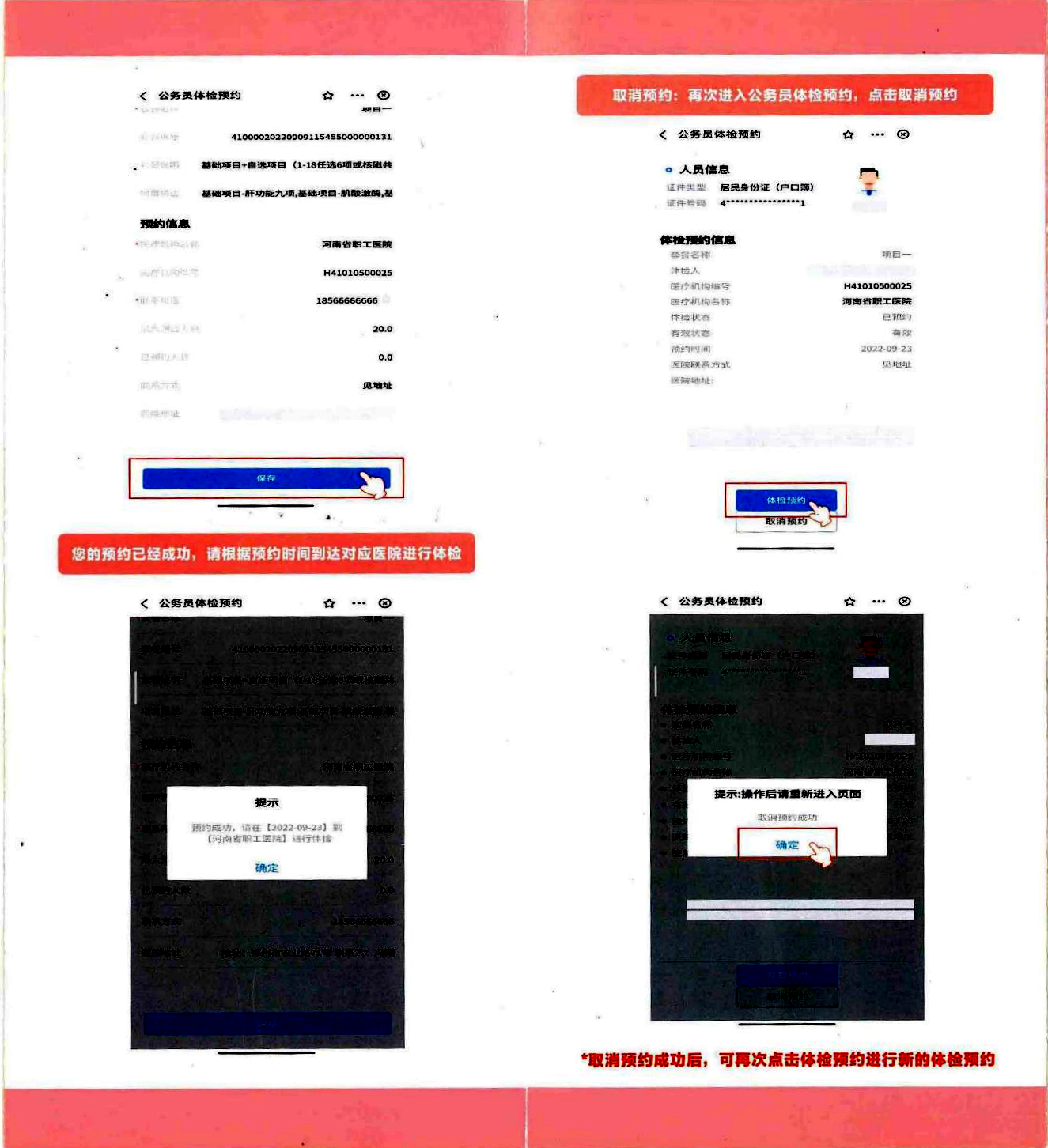 (一)方式一:线上预约体检。(预约操作手册见附件1)参检人员可通过微信小程序“河南省医疗保障服务中心” /支付宝小程序“河南医保”进行体检预约、选定医院、选择项目等(未去体检前可以自行撤销后再次预约),也可直接前往定点体检医院进行线下预约体检。定点体检医院可根据预约推送情况合理安排体检人数。异地安置人员可选择回郑州体检,如不能回郑州体检的,可在异地就医定点医院中选择一家医院进行体检。