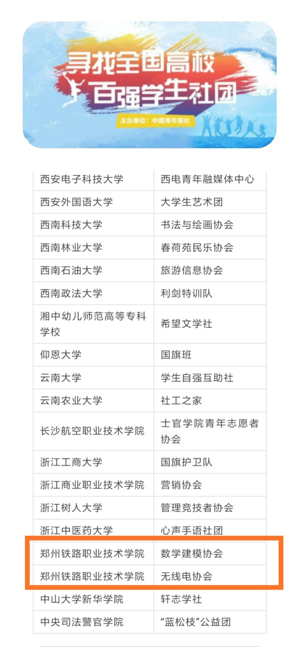 近日,由中国青年报主办的“寻找全国高校百强学生社团”活动落下帷幕。经高校推荐、社团自荐、社团展示、网络投票、技术筛查、专家评审等环节后,全国高校百强学生社团名单出炉。我校数学建模协会、无线电协会成功入选全国高校“百强社团”。我校成为河南省高校入选数量最多的高校之一,也是全国职业院校入选数量最多的高校之一。