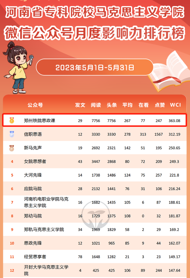 6月12日,由官方媒体豫教思语发布的“河南省高校马院微信公众号月度影响力排行榜(5月)”排名数据显示,马克思主义学院官方微信公众号“郑州铁院思政课”在全省专科院校马院官方微信公众号月排行中以363.08的WCI指数跃居榜单第1位,在全省本专科马院总排名中,位居第4位。