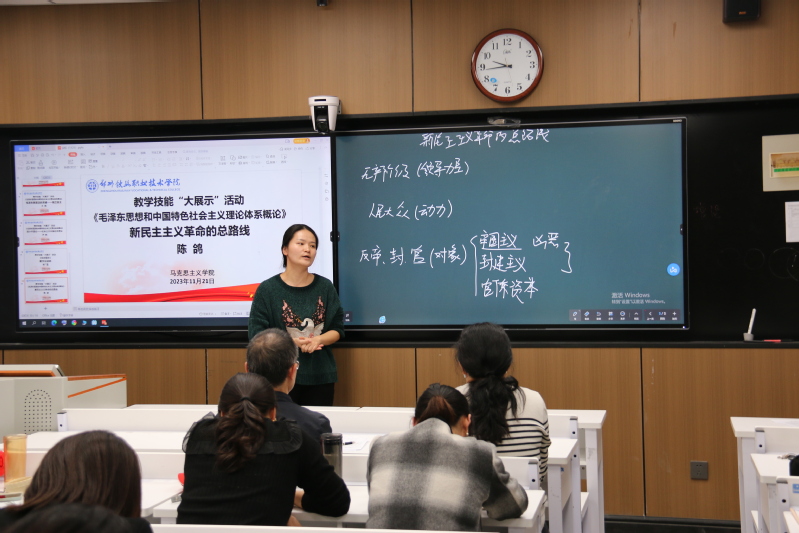 本次展示活动由晏娟娟老师打头阵,晏老师展示的题目为《增强中华民族伟大复兴信心》。在展示环节,晏老师运用丰富的授课案例,将学习通等多媒体技术融会贯通,引发了老师们的热烈掌声。接着吕娜老师进行展示,吕老师展示的题目为《新民主主义社会是一个过渡性的社会》。在展示中吕老师授课仪态自然、娓娓道来,展示了其丰富的授课经验和较高的理论水平。第三个展示的是申艳婷老师,申老师展示的题目为《坚持依法治国与以德治国相结合》。在授课中,申老师引经据典,运用了大量的史书典籍来论证教学观点,展现了其丰厚的学识和过人的专业知识。第四个展示的是王雨老师,王老师展示的题目为《毛泽东思想活的灵魂——独立自主》,王老师将毛泽东诗词融入课堂讲授,具有较强的吸引力和创新性。接着,尹航老师进行展示,他展示的题目为《邓小平理论——社会主义市场经济理论》,尹老师的授课将经济学的专业知识巧妙融入思政课堂中,逻辑清晰、有层次,有效地论证了其授课观点。第六个进行展示的是张广磊老师,张老师展示题目为《新文化运动》,在展示环节张老师的讲授慷慨激昂、引人入胜,通过案例的对比论证,博得了观摩教师的阵阵喝彩。最后一个展示的是陈鸽老师,陈老师展示的主题为《新民主主义革命的总路线》,陈老师巧妙运用板书,结合学生的学习特点,将总路线的内容讲解得十分清晰、透彻、到位。