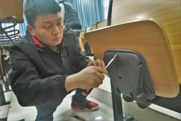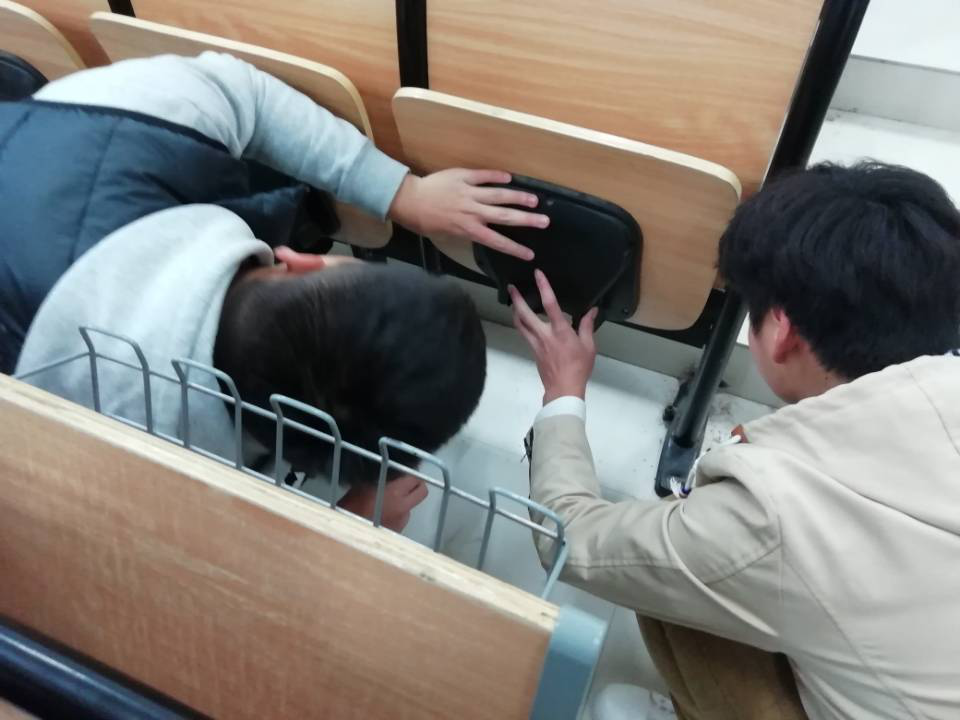 七号楼阶梯教室板凳维修,一些板凳的螺丝松动,板凳内的弹簧错位,维修志愿者们拆开,修正,再组装。