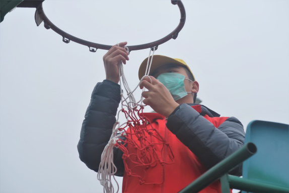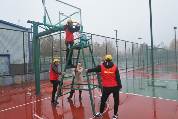 蓝球网维修,志愿者们更换了损坏的蓝球网,为的就是让热爱蓝球小伙伴体验到更好的比赛乐趣