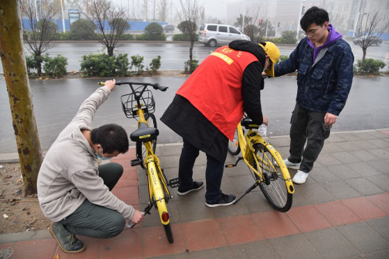 校东门共享单车维修,通过简单的维修及保洁,再把散落的单车集中安置在特定的位置,便利同学们的出行。