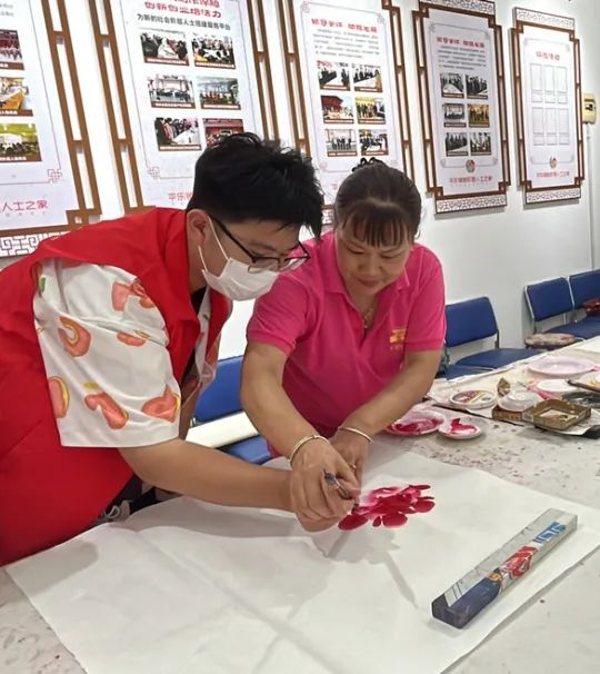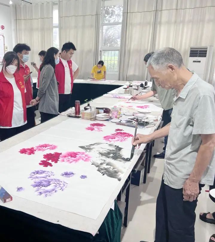 队员们了解到,许多农民画师经常受邀到全国各地作画,或者是通过直播、电商的方式将绘画作品销售到全国各地,而受方言根深蒂固的影响,画师的普通话并不标准、流畅,缺少普通话自信。活动期间,实践队员们充分发挥自身优势,采用示范朗读、课堂教学、发音纠正等形式进行纠音,让画师们逐渐做到发音正确、吐字清晰。同时,实践队员通过向画师请教牡丹画的画法,不仅亲身感受到牡丹文化的独特魅力,更在与画师的交流中提升画师的普通话表达能力。