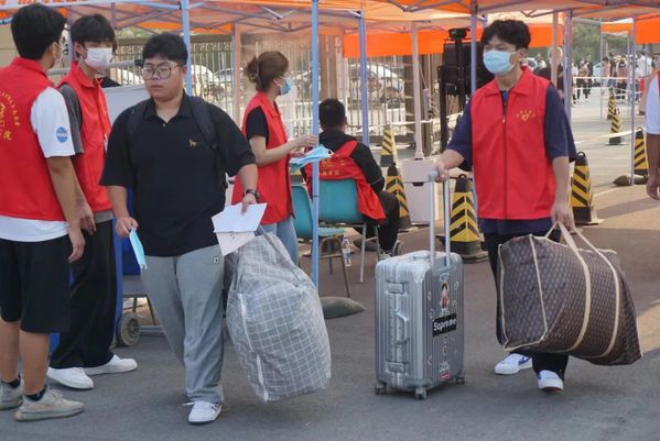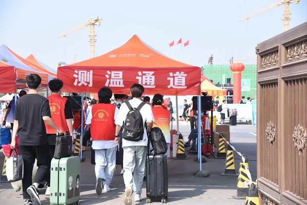 新老校区迎新拱门、帐篷提前一天摆放整齐,各类消杀工具配置完成。16日一早,我校团学干部和志愿者准时来到工作岗位,以高昂的热情投入到迎新工作中。我校在学校门口设立入校通道,志愿者核验过新生的健康码、行程码、核酸检测结果,为新生消杀行李、更换口罩后,新生方可进入校园。