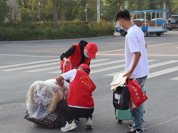 “我来帮你”“行李交给我”,志愿者们接过新生手中沉重的行李,引导新生乘坐迎新专车,不辞劳苦,热情洋溢,为新生提供贴心且周到的服务。有的新生受到感召,放下自己的行囊后就转身投入到迎接新同学的行列中。