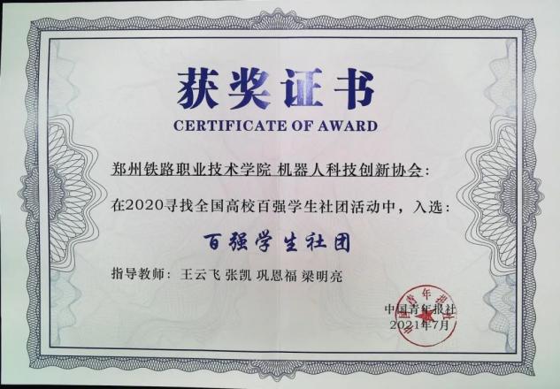 环球360管理网机器人科技创新协会获得了“全国学生最具影响力科技社团”、“全国学生最具影响力科技创造社团”、“全国百强学生社团”、“河南省文明社团”学校“优秀社团”等荣誉称号。近几年社团优秀会员参加各类全国、省级学科类竞赛取得了骄人的成绩,累计获得国际赛三等奖1个、全国一等奖20个、全国二等奖12个、全国三等奖3个,河南省特等奖1个、河南省一等奖68个、河南省二等奖76个、河南省三等奖91个。在社团指导老师及机器人科技创新协会团支部的带领下,社团优秀会员在科技创新项目孵化及培育的过程中共申请国家专利50余项,已授权33项,创立了4家以学生为法人的公司。学生在科技创新竞赛中成长学习,培养了学生社会责任感及创新精神,提高了学生的实践能力,提升了学生的综合素质,促进学生成长成才。下面是荣誉展示: