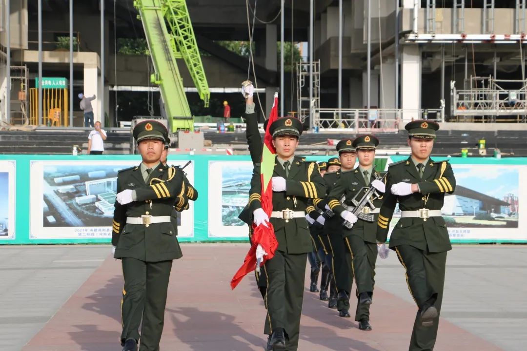 在升旗仪式现场,学校国旗护卫队队员身着礼宾服、手执礼宾枪,迈着整齐划一、铿锵有力的步伐,将国旗护送至升旗台。伴随着雄壮的《义勇军进行曲》,五星红旗冉冉升起,全体在场师生齐唱国歌,行注目礼。