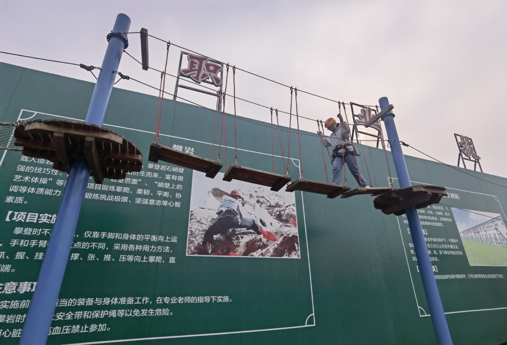学生进行中空项目(穿越森林)和高空项目(攀岩)的练习