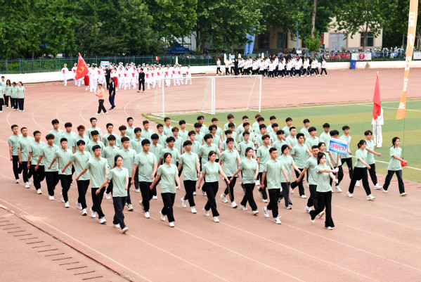 伴随着激昂的《运动员进行曲》,国旗、会徽、标语、红旗、花束5个特色方阵,14支“书院+学院”学生方阵队伍、教工代表队依次步入会场。
