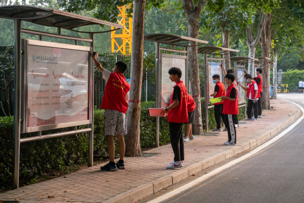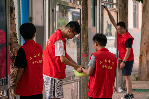 为迎接新生,构建良好的校容校貌和环境卫生,营造新生返校氛围,9月14日下午,学校青年志愿者协会组织志愿者在校内开展志愿服务活动,本次志愿服务的主要内容是对铁龙广场和二号楼周围宣传橱窗进行清洁。