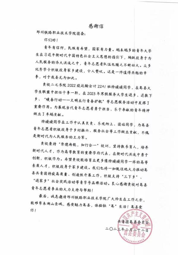 近日,我校团委收到来自共青团嵩县委员会的3封感谢信,高度赞扬了我校二七书院室内设计22A1班宋佳林同学、运输会计22A1班徐媛媛同学、钢琴调律22A1班马嘉欣同学在2023年寒假服务大学生返乡活动中的突出表现。信中提到:这三位同学在2023年寒假服务大学生返乡、送教下乡、“暖春行动--文明出行青春护航”等志愿服务活动中发挥了重要作用。为展现当代青年志愿者勇于担当、乐于奉献的青年精神做出了卓越贡献,并表达出与我校加强交流合作,更好的服务青年成长成才的意向。