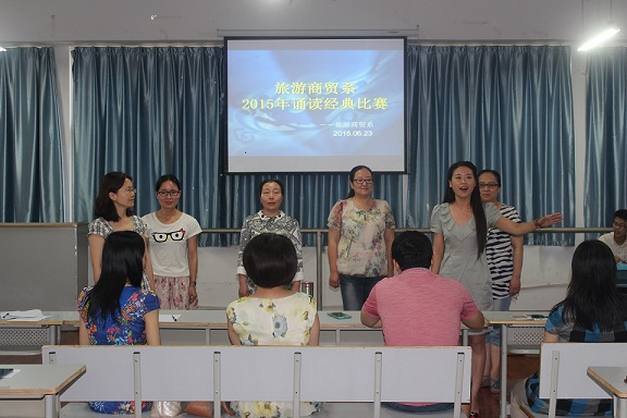 6月23日下午,旅游商贸系在新501教室举办了2015年诵读经典诗歌朗诵比赛。本次大赛共分为七个小组,由各办公室负责人及教研室主任担任评委。系主任张磊、系党总支书记张红云出席大赛。