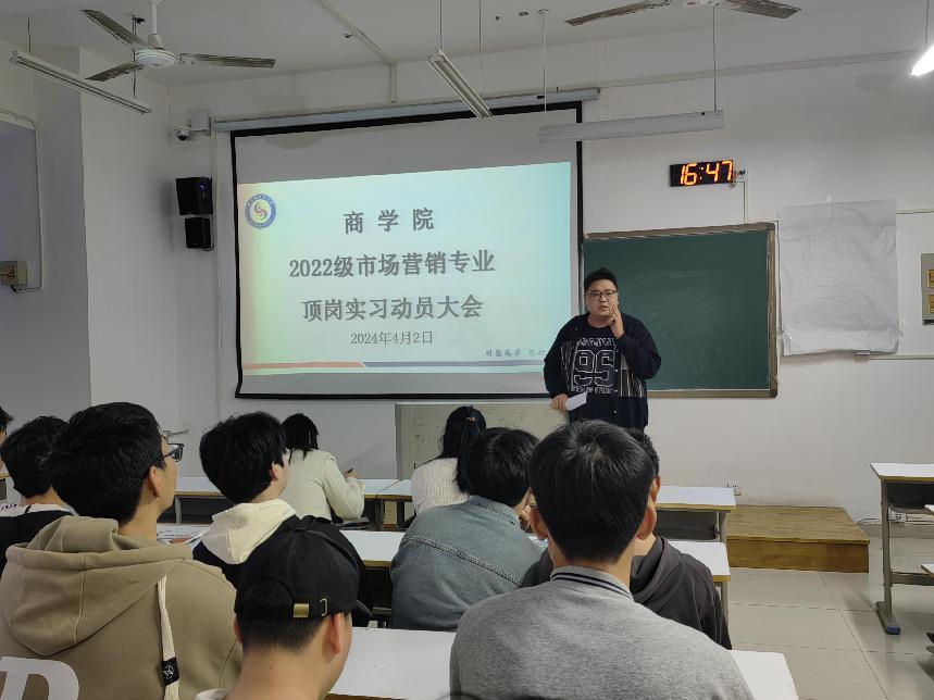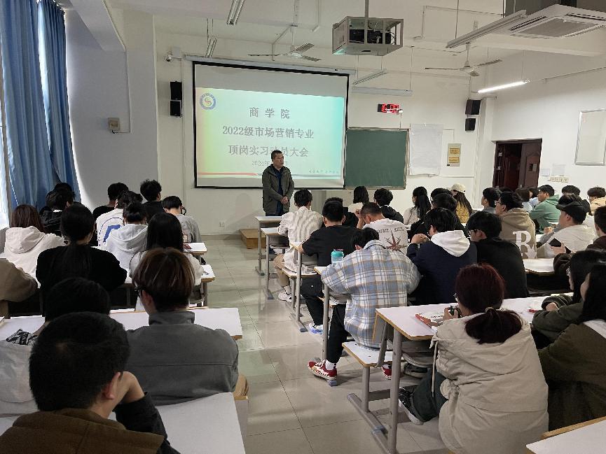 4月2日下午,商学院在8306教室组织召开市场营销专业学生实习动员大会。商学院院长刘波、经济管理教研室主任戚萌、实习指导教师王晓华、周扬扬、李韦佳及2022级市场营销专业全体学生参加会议。