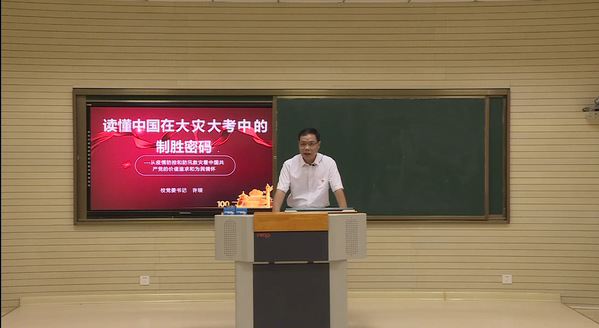 党委书记许琰以上率下,以《读懂中国在大灾大考中的制胜密码》为题作了专题宣讲。许琰从三个方面给师生上了一堂内容丰富、催人奋进、精彩纷呈的大课。一是在大灾大考中彰显“中国共产党为什么能”。以习近平同志为核心的党中央的坚强领导力,是战胜大灾大考的定海神针;党的各级组织高效的执行力,是战胜大灾大考的坚强支撑;广大共产党员和党员干部的先锋模范力,是战胜大灾大考的中坚力量。二是在人民至上的价值追求中“中国特色社会主义制度为什么好”。恪守以人民为中心,是中国制度的民心基础;坚持全国一盘棋,是中国制度高效运转的有力支撑;弘扬中国精神和凝聚中国力量,是中国制度优势的直接体现。三是在躬行实践中回答“强国有我、请党放心”的铮铮誓言。听党话、跟党走,坚定理想信念;知责任、担使命,践行志愿精神;勤学习、长本领,矢志报效国家。