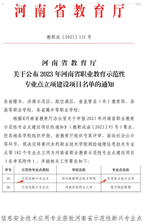 自2013年我校在河南省高职院校中率先开设信息安全技术应用专业以来,经过多年的深耕细作,专业建设成果显著。2023年,信息安全技术应用专业成功获批河南省示范性新兴专业点,标志着专业建设达到新的高度。