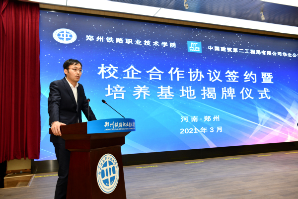 仪式上,党委书记许琰代表学校向中建二局华北公司对学校发展给予的支持和帮助表示衷心感谢。他指出,中建二局华北公司始终坚持以高质量产品回馈业主和社会,以高质量运营实现国有资产保值增值,在改革发展中取得了突出成绩,先后荣获鲁班奖、詹天佑奖、国家优质工程奖等国家级大奖50余项,形成以京津冀为核心,辐射山西、山东、河南、陕西的经营战略布局。此次签约合作协议、共建培养基地,既契合国家职业教育发展,也是对双方互信合作的充分肯定与传承,更是进一步凝聚共识,深化产教融合、校企合作,开启共同发展新篇章的全新出发。