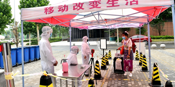 The student passed through the dormitory channel to accept the body temperature check and disinfection