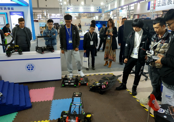 In the exhibition, the school extensively propagandized the school history, achievements and experience in the forms of video, poster and picture album. Among the vocational colleges participating in the exhibition, our college was distinguished and displayed ourselves with the theme of talents cultivation achievements by the scientific and technical community, assigned the team composed of the robot technology and innovation association and the radio association and participating in the National Undergraduate Robot Contest to the exhibition with 9 competition robots and demonstrated several competition projects, such as “flag pulling”, “fortress attack” and robot combat, which were extremely eye-catching and attracting many domestic and foreign exhibitor representatives. Many other colleges took the initiative to exchange with us for and learn the experience of the organization of the robot contest project. The contestants of the BRICS youthful creator contest organized by the summit for the same period also came to the booth and exchanged with the student representatives of the communities of the school.