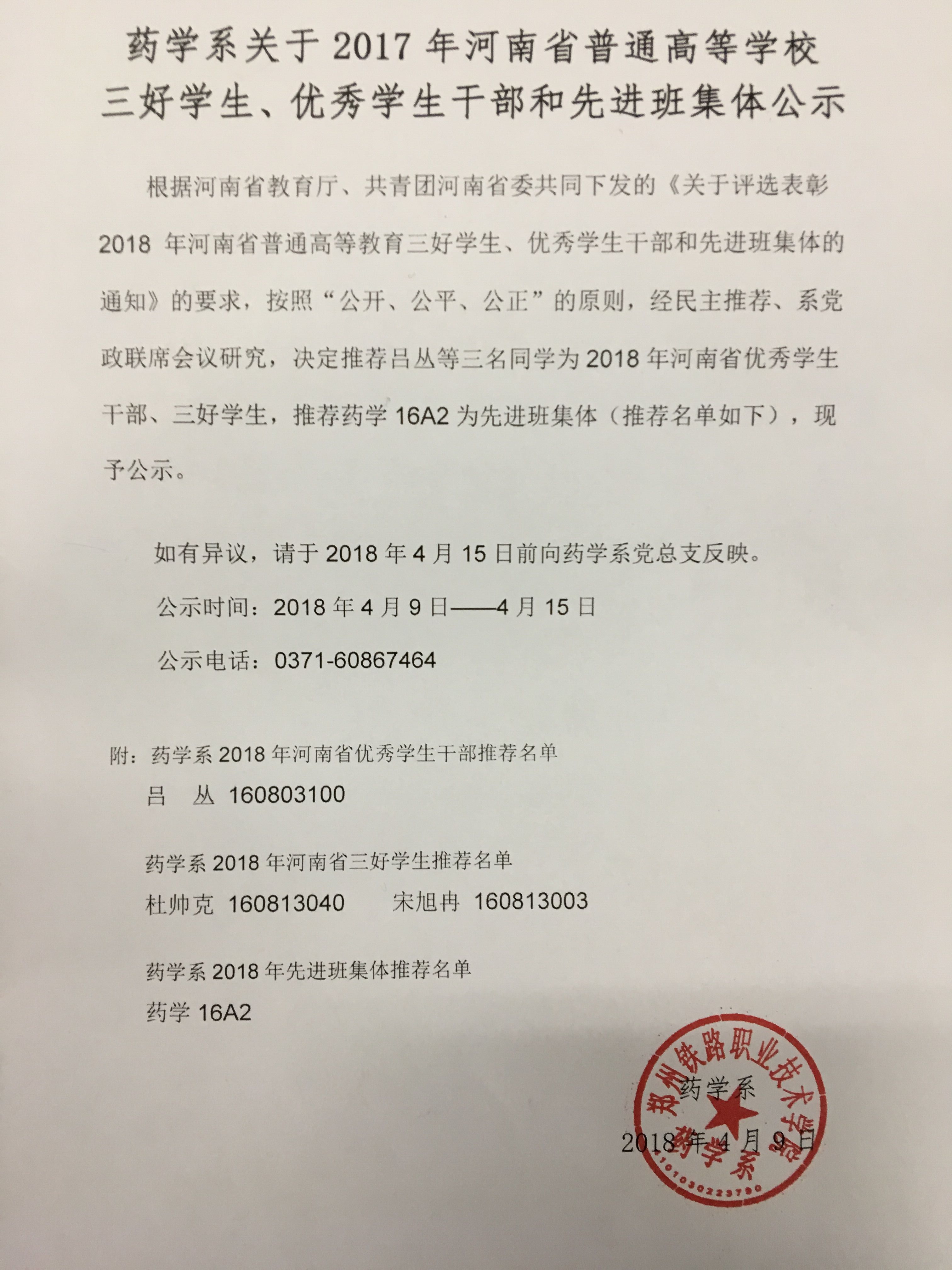 药学系关于2017年河南省普通高等学校三好学生、优秀学生干部和先进班集体公示