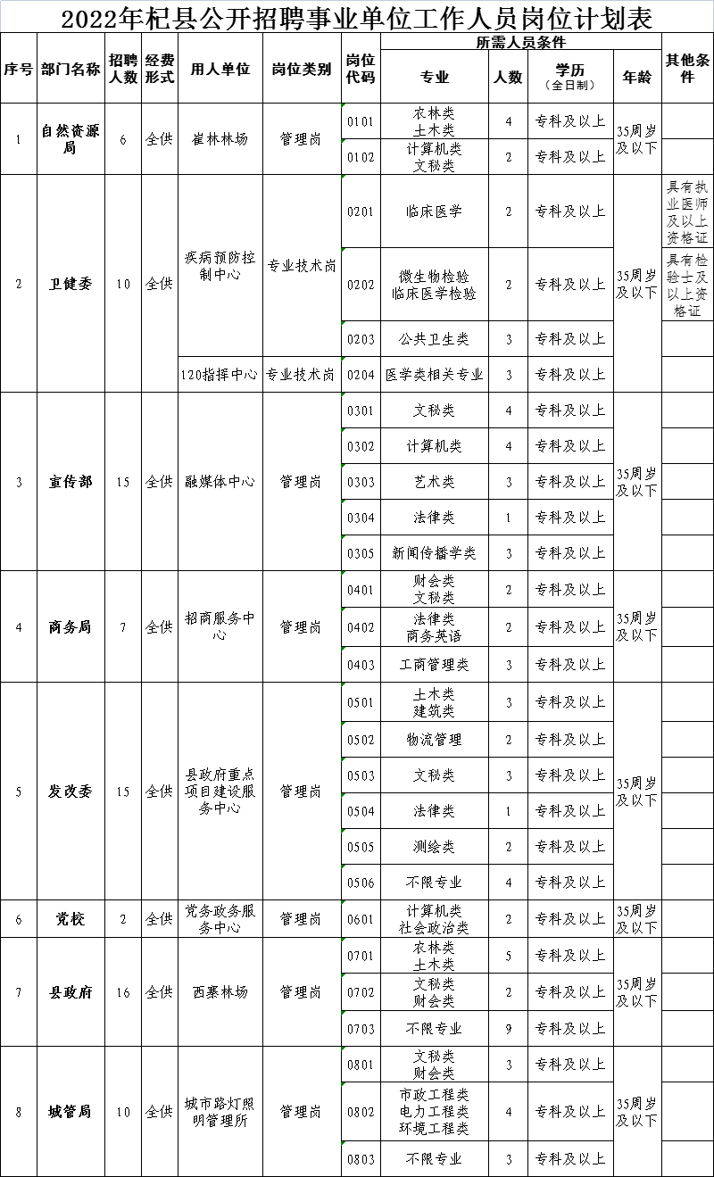 本次招聘涉及8个单位,招聘事业全供人员共计81名。具体招聘专业、岗位、人数及要求详见《2022年杞县公开招聘事业单位工作人员岗位计划表》。